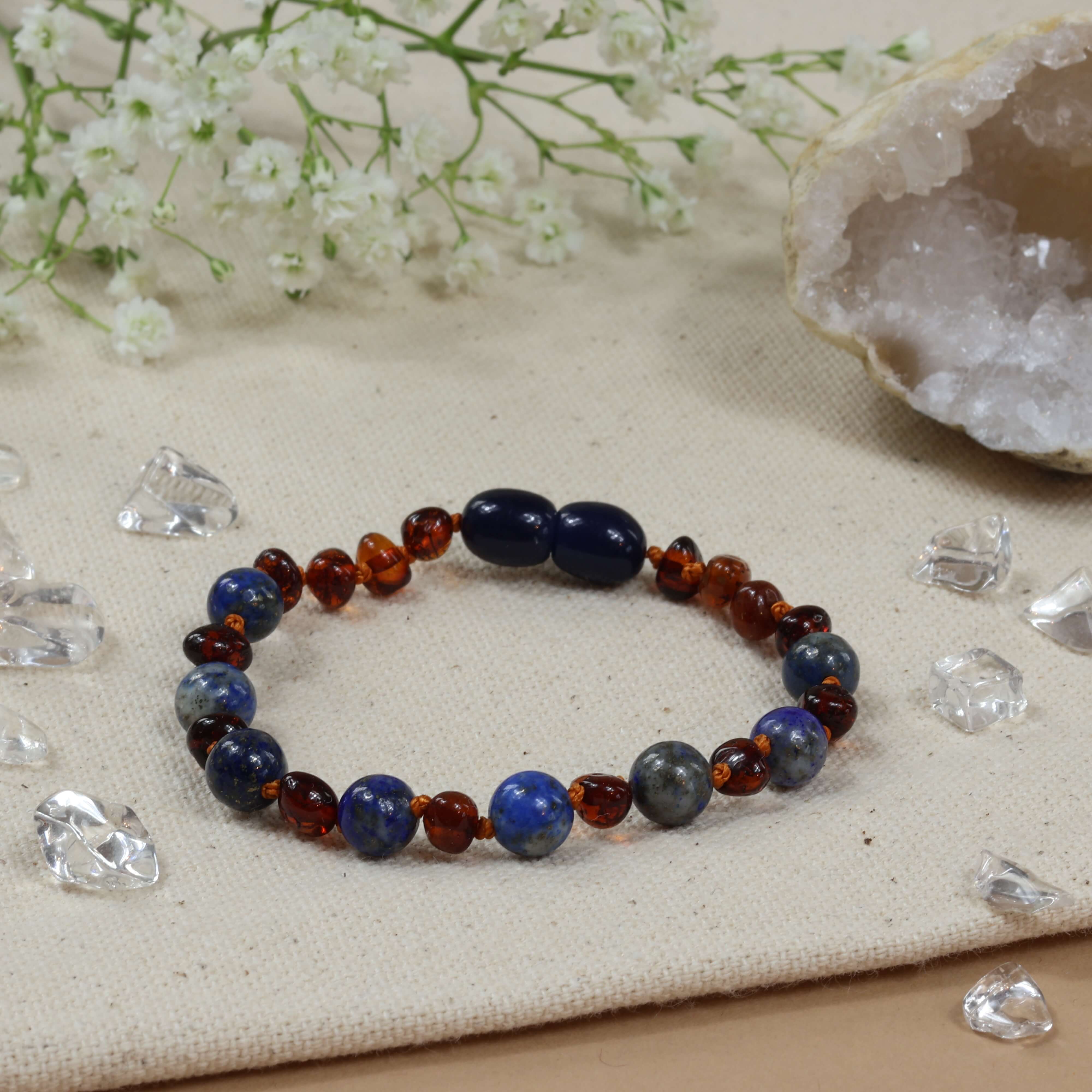 Beschrijving van Baby Natura Barnsteen armband baby/peuter cognac – lapis lazuli