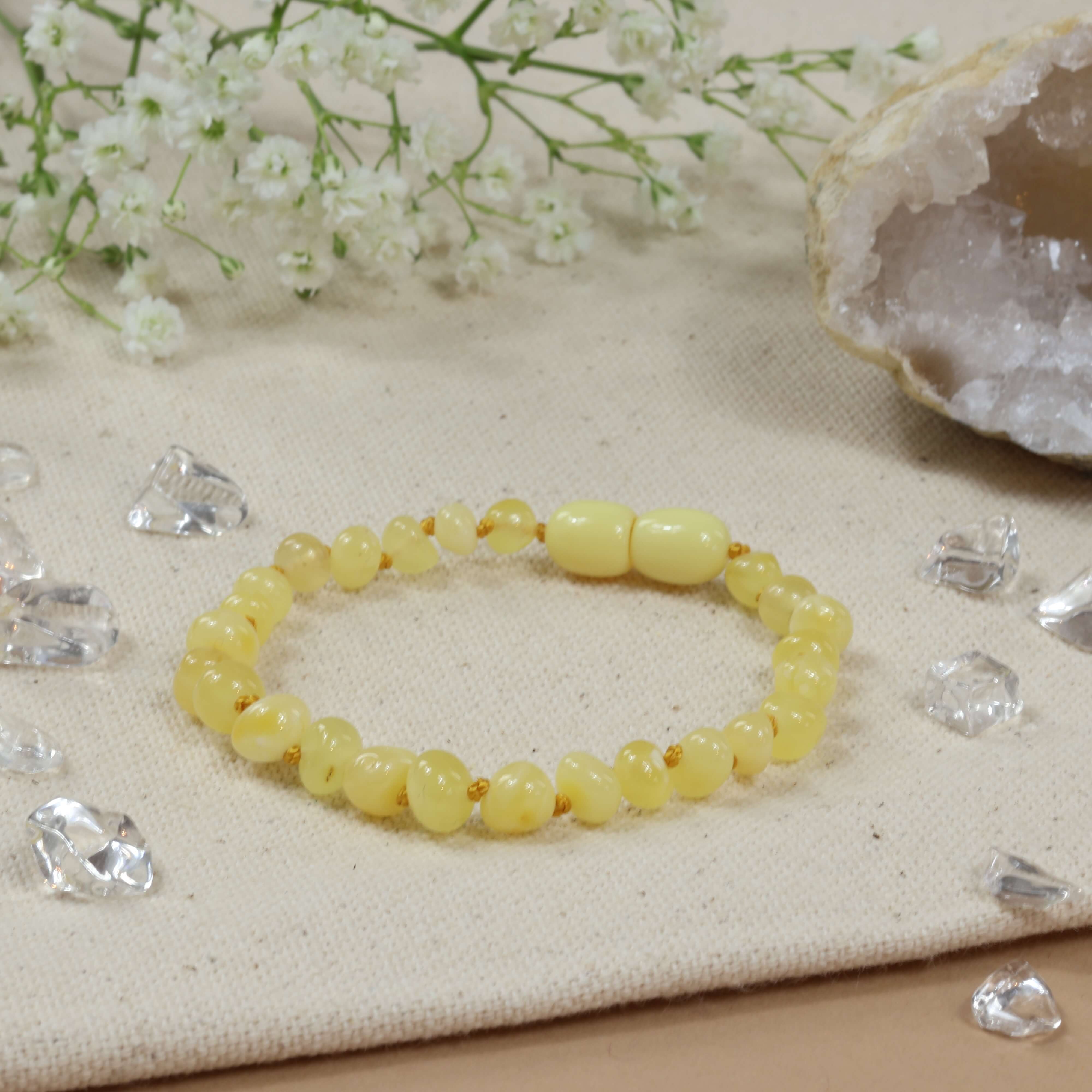 Barnsteen is een natuurlijk product wat is ontstaan uit plantenhars. Al eeuwenlang wordt barnsteen ingezet om verschillende aandoeningen te behandelen. Wanneer barnsteen tegen de huid wordt gedragen, geeft de warmte van de huid de helende oliën en barnsteenzuur vrij. De huid neemt deze oliën en zuren op. Het barnsteenzuur heeft een pijnstillende en ontstekingsremmende werking. Perfect om je baby of peuter de ondersteunen tijdens ziekte en ongemak.