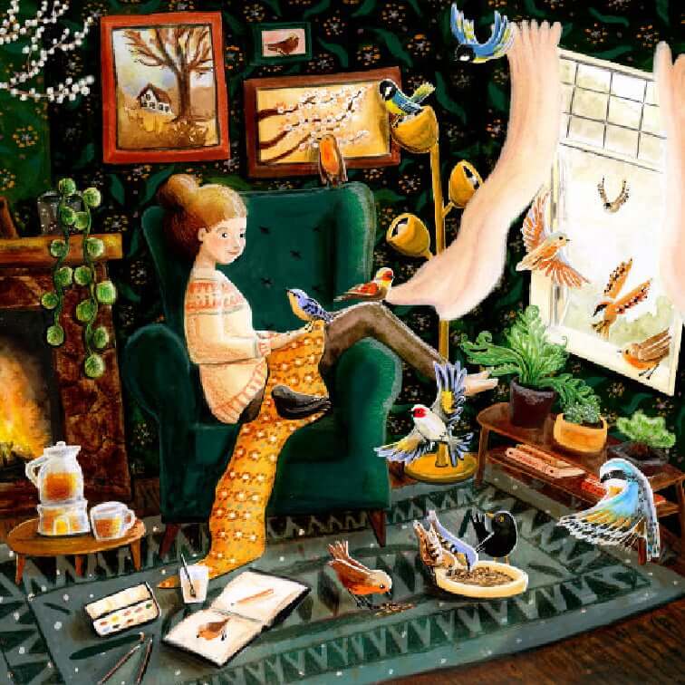 De Nederlandse ‘Illustrator under a blankie’ Esther Bennink creëert werelden die gevoelens van knusheid, geborgenheid en verwondering oproepen. Ze combineert voor haar illustraties verschillende materialen, met aquarelverf in de hoofdrol.
