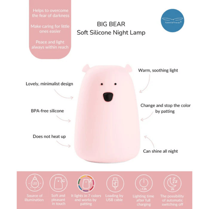 De lamp is gemaakt van soepel en BPA vrij siliconen, waardoor hij heerlijk zacht aanvoelt en veilig is voor kleine handjes. Je kindje kan hem gerust vasthouden of meenemen naar bed. De verlichting blijft koel tijdens gebruik, wat zorgt voor een extra veilig gevoel, ook in de nacht.
