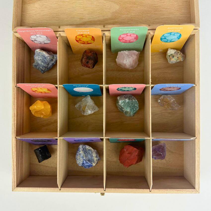 Premium edelstenen steker set, compleet met opbergdoos en 12 edelsteen stekers + bijpassende kaartjes.