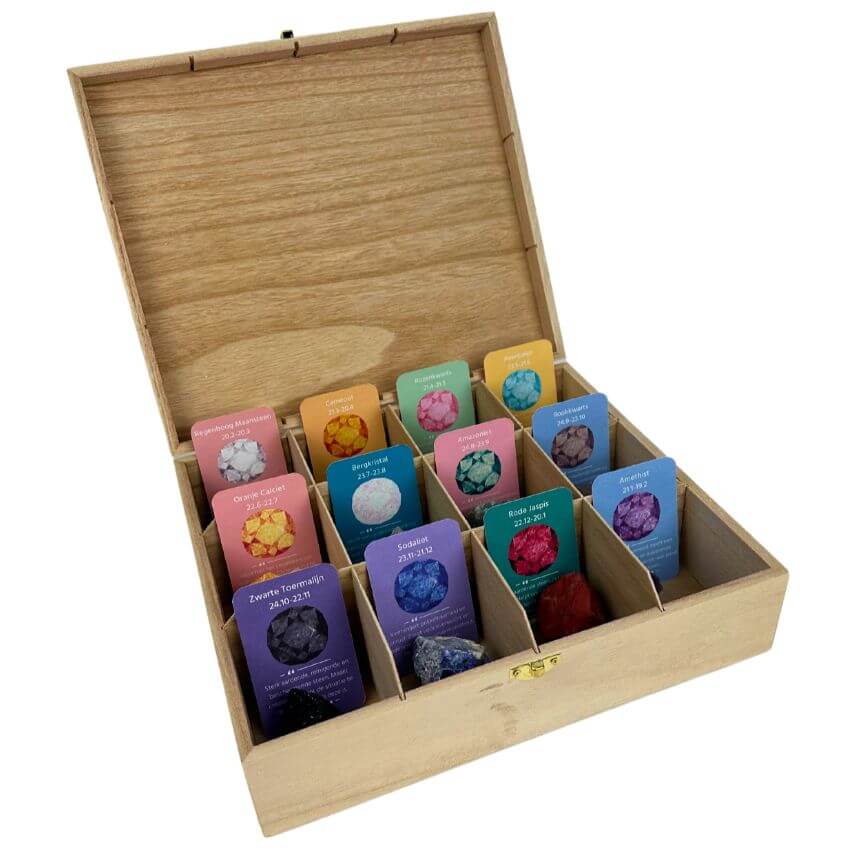 - Bevat: 12 unieke edelsteen stekers passend bij de 12 verschillende sterrenbeelden - 1 bewaardoos - 12 sterrenbeeld kaartjes.