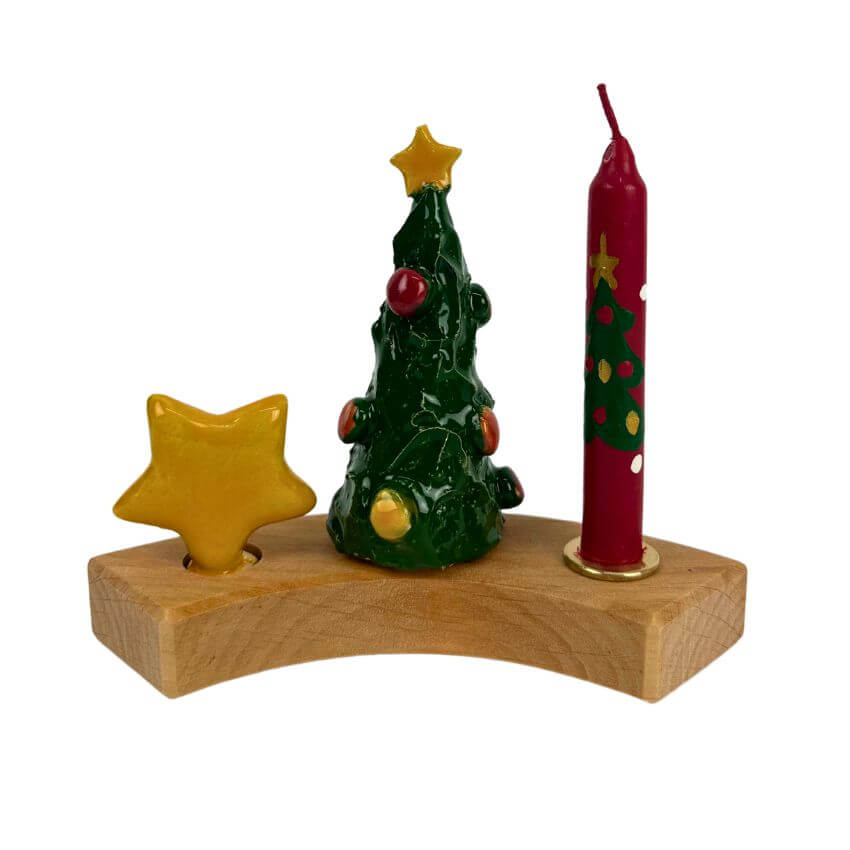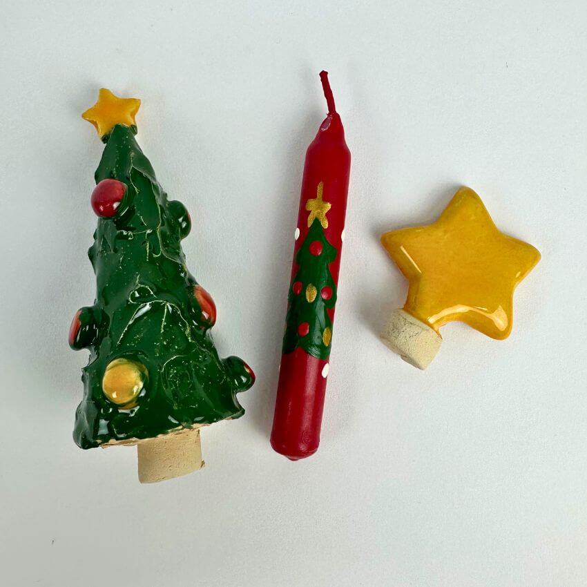 De 3-delige set bestaat uit 2 handgemaakte stekers van keramiek (ster, kerstboom) en een Kerst jaarring kaarsje.