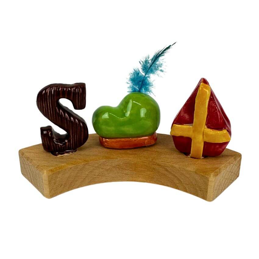 De 3-delige set bestaat uit 3 handgemaakte stekers van keramiek (mijter, pietenmuts, chocoladeletter)